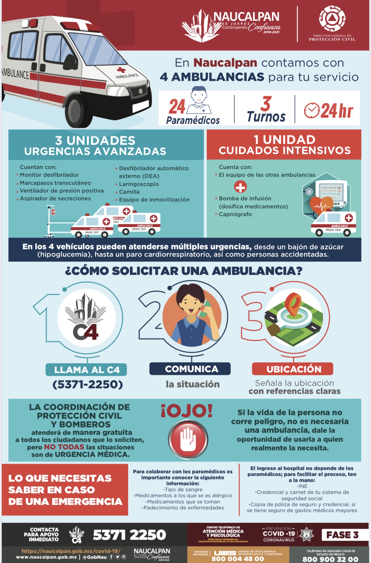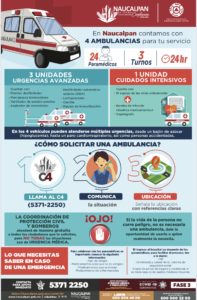 El Gobierno de Naucalpan tiene a disposición de los naucalpenses el C4 (5371-2250), al que los ciudadanos pueden pedir una ambulancia. Es importante que la persona solicitante comunique la situación y sea precisa con la dirección a la que hay que acudir.