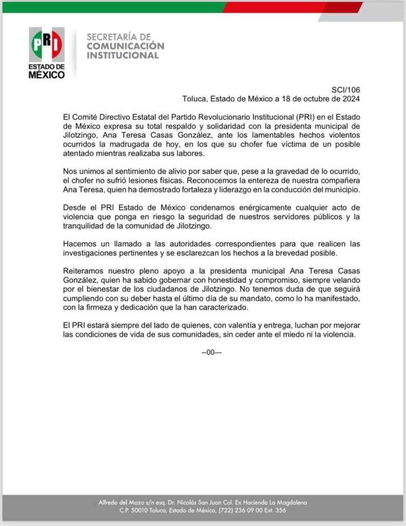 El Comité Directivo Estatal del Partido Revolucionario Institucional (PRI) en el Estado de México expresa su total respaldo y solidaridad con la presidenta municipal de Jilotzingo, Ana Teresa Casas González, ante los lamentables hechos violentos ocurridos la madrugada de hoy, en los q
