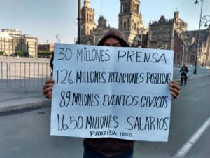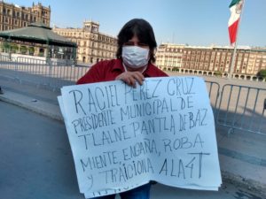 Ciudad de México.- Una vez más, líderes sociales y habitantes del municipio de Tlalnepantla, se manifestaron la mañana de ayer frente a Palacio Nacional para demandar al Presidente de México, Andrés Manuel López Obrador, “ordene una auditoría a la gestión del alcalde de esa localidad, Raciel Pérez Cruz, quien enre otras cosas, aprovecha la contingencia sanitaria para promocionar su imagen entregando despensas a cambio de la copia de la credencial de elector”.