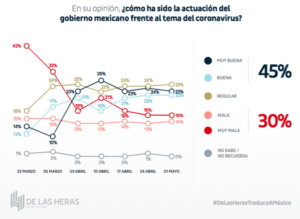 Un reconocido encuestador dio a conocer que la aprobación de Andrés Manuel López Obrador, Presidente de México no ha bajado, sino que subió 8 puntos, mientras otra encuesta indicó que 45%, la mayoría ve “muy buena” o “buena” la actuación del gobierno mexicano frente al tema del Coronavirus.