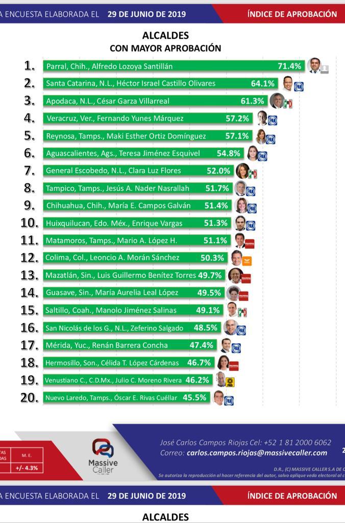 De acuerdo a la más reciente encuesta “Índice de Aprobación de los principales Alcaldes del país”, realizada por la empresa Massive Caller, ubican a Vargas del Villar, en el ranking de los 10 ediles de México con la mejor evaluación.
