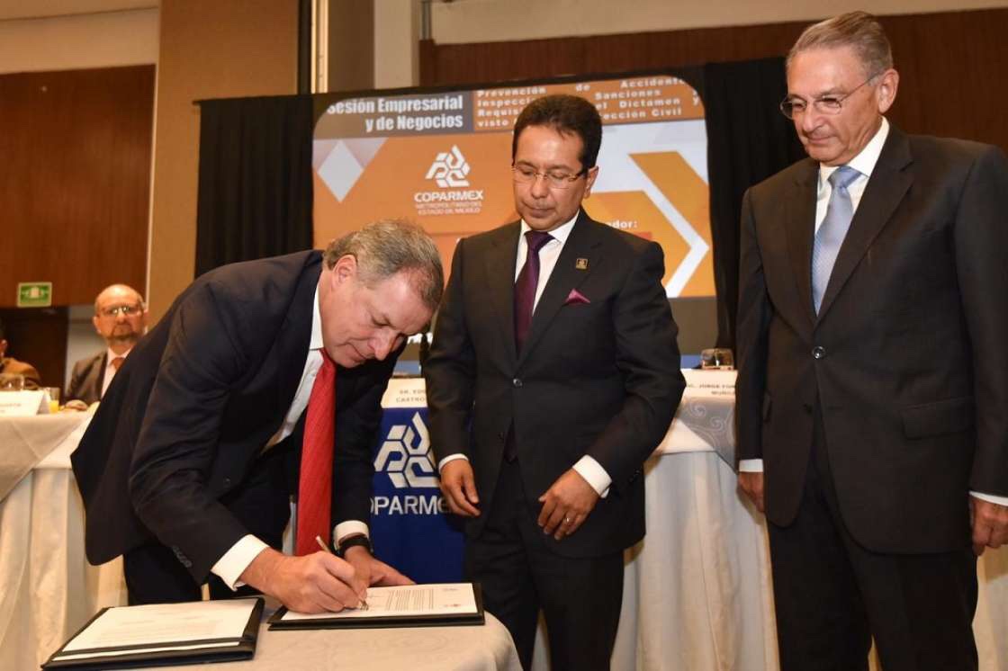 TLALNEPANTLA, México.- El presidente de Coparmex Metropolitano Edgar Castro Cid, signó un convenio de trabajo con el Coordinador de Protección Civil del Gobierno del Estado de México, Luis Felipe Puente, y el Delegado estatal de Cruz Roja Edoméx, Jorge Forastieri Muñoz, teniendo como testigo de honor al diputado Presidente de la Comisión de Protección Civil en la Legislatura Mexiquense, Max Correa Hernández, cuyo objetivo es trabajar coordinadamente en pro de la salud preventiva de la población, a través de jornadas de salud en las comunidades, al interior de las empresas y con la realización de foros y talleres de cultura de prevención de emergencias y gestión de riesgos.