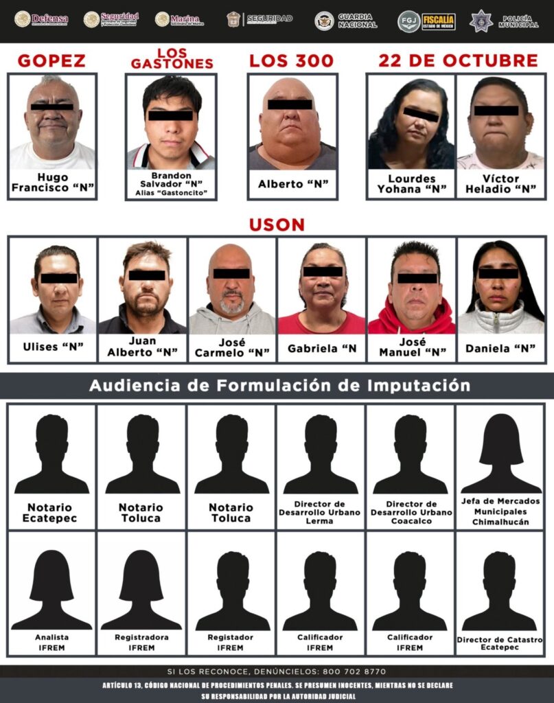 Entre los detenidos destaca José Carmelo “N”, quien habría amenazado a una víctima con sacar a su familia de su casa si no pagaba una “cuota”. También fue aprehendida Gabriela “N”, acusada de apropiarse de un domicilio en Ecatepec y exigir dinero para su devolución. Otros detenidos de “USON” —como Ulises “N”, Juan Alberto “N” y José Manuel “N”— fueron señalados por intimidar con armas de fuego a propietarios en Ciudad Amanecer, Ecatepec.