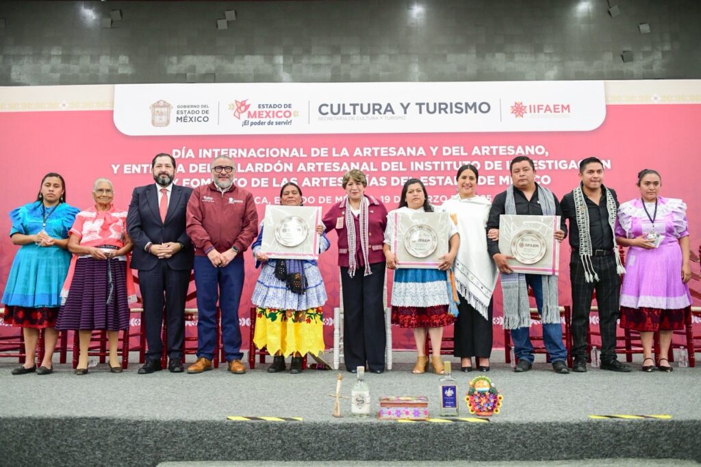 Toluca, Estado de México; 19 de marzo de 2025. En una ceremonia conmemorativa por el Día Internacional del Artesano, la Gobernadora Delfina Gómez Álvarez entregó el Primer Galardón Artesanal a 78 maestras y maestros artesanos del Estado de México, reconociendo su trayectoria, mérito e impacto en la conservación y promoción de las tradiciones mexiquenses.
