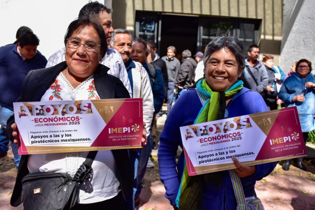 TOLUCA, Méx.– Con el objetivo de reforzar la seguridad, mejorar las condiciones laborales y fortalecer la infraestructura de quienes se dedican a la pirotecnia en el Estado de México, el Gobierno encabezado por la Maestra Delfina Gómez Álvarez, a través de la Secretaría General de Gobierno y del Instituto Mexiquense de la Pirotecnia (Imepi), entregó apoyos económicos a 44 artesanas y artesanos pirotécnicos.