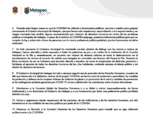 El pronunciamiento concluye exhortando a la Comisión Estatal de Derechos Humanos y a su titular a actuar responsablemente, de forma institucional y a no discriminar al Gobierno de Metepec y a sus funcionarios por tener una preferencia política-partidista distinta a la suya.