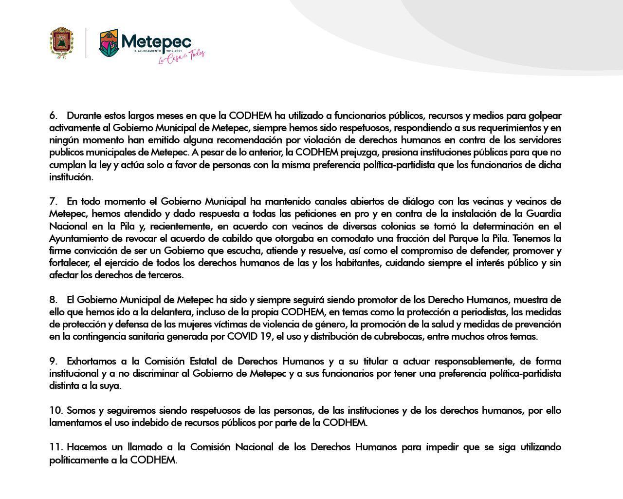 Asimismo, asegura que durante meses, la CODHEM ha utilizado a funcionarios públicos, recursos y medios para golpear activamente al Gobierno Municipal de Metepec, «siempre hemos sido respetuosos, respondiendo a sus requerimientos y en ningún momento han emitido alguna recomendación por violación de derechos humanos en contra de los servidores públicos municipales de Metepec. A pesar de lo anterior, la CODHEM prejuzga, presiona instituciones públicas para que no cumplan la ley y actúa solo a favor de personas con la misma preferencia política-partidista que los funcionarios de dicha institución».