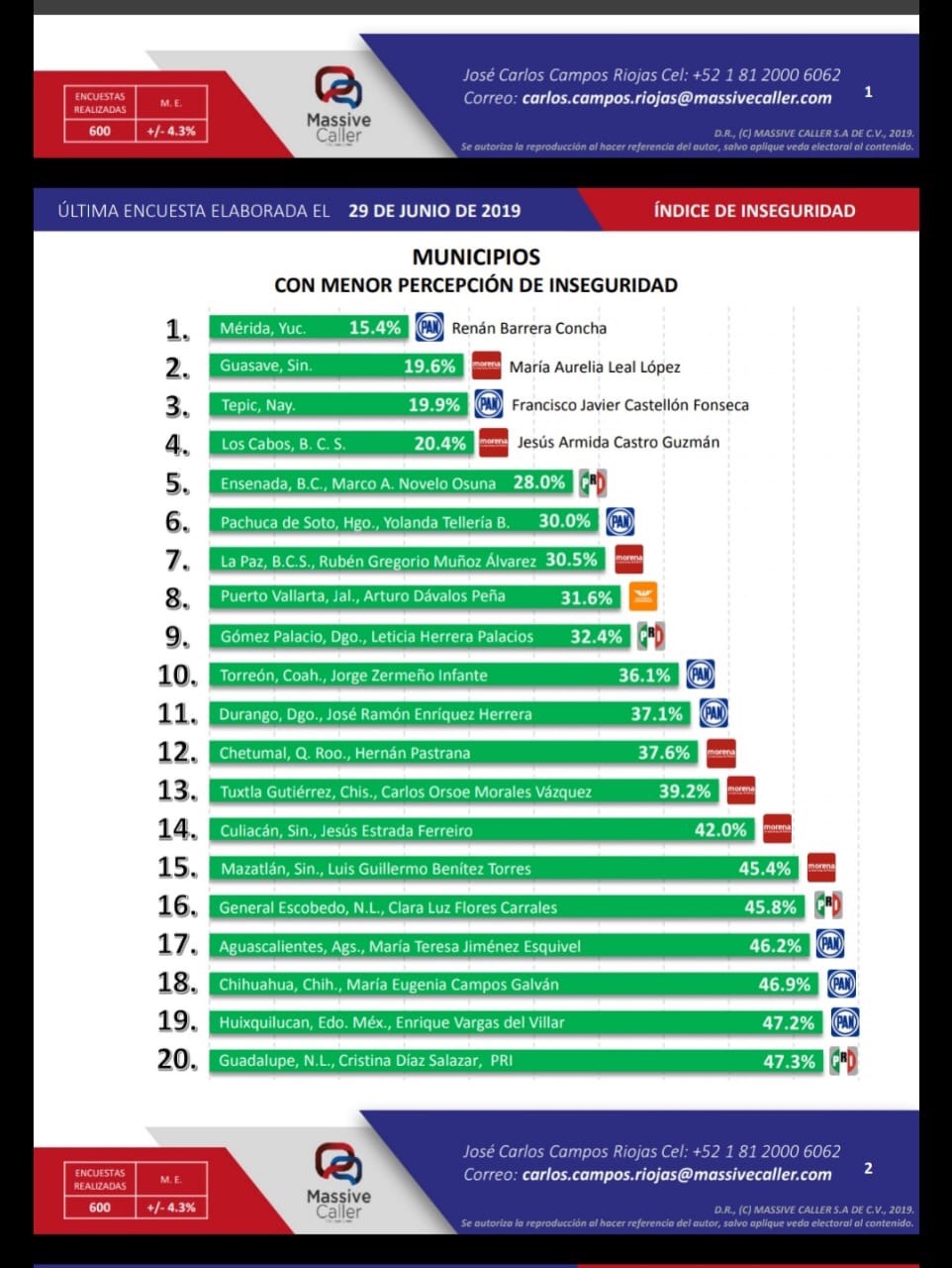 La empresa Massive Caller, realizó una encuesta que calificó a los 100 municipios más importantes de México con menor percepción de inseguridad.