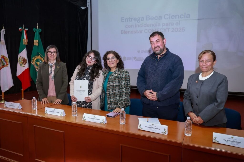Atizapán, Méx.— En un acto que refrenda el compromiso institucional con la formación científica y el desarrollo humano, la rectora de la Universidad Autónoma del Estado de México (UAEMéx), Martha Patricia Zarza Delgado, encabezó la entrega simbólica de las tarjetas de la Beca Ciencia con Incidencia para el Bienestar 2025, un estímulo impulsado en conjunto con el Consejo Mexiquense de Ciencia y Tecnología (COMECyT).