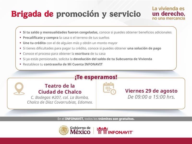 Chalco, Estado de México, 28 de agosto de 2025.– Con el propósito de acercar sus productos de financiamiento y brindar atención directa a las y los trabajadores, el Instituto del Fondo Nacional de la Vivienda para los Trabajadores (INFONAVIT) llevará a cabo su Brigada de Promoción y Servicio en el municipio de Chalco.