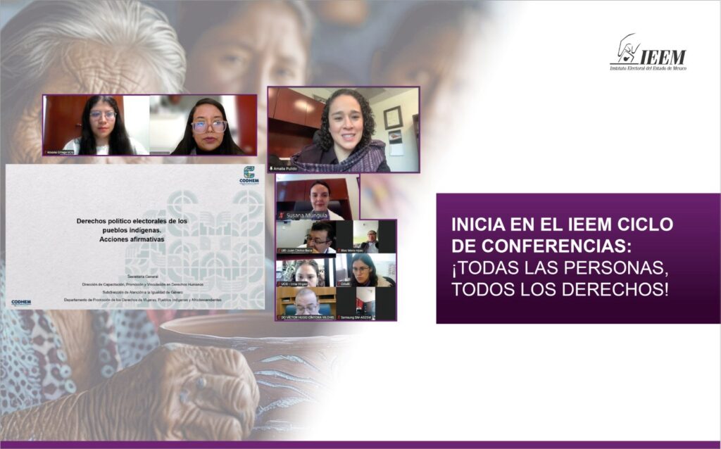 Toluca, Estado de México.– El Instituto Electoral del Estado de México (IEEM) inició el ciclo de conferencias “¡Todas las personas, todos los derechos!”, un espacio de diálogo y reflexión enfocado en la construcción de una democracia incluyente que garantice la representación efectiva de los pueblos y comunidades indígenas en la entidad.