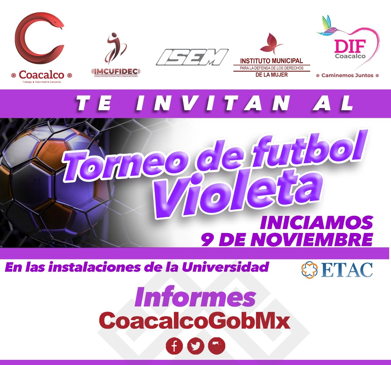 COACALCO DE BERRIOZÁBAL, 26 DE OCTUBRE DE 2019.- Como parte de las políticas públicas con perspectiva de género que impulsa el Gobierno de Coacalco de Berriozábal, encabezado por el Alcalde, Darwin Eslava, el próximo 9 de noviembre se realizará el Torneo Violeta por la Paz.