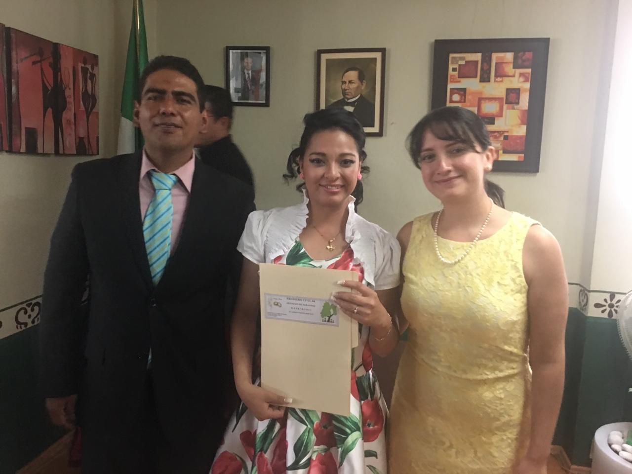 La feliz pareja contrajo nupcias apoyada por la titular de la oficialía, Lorena Paredes González, quien señaló que “tenemos la responsabilidad de ser una sociedad incluyente y como institución de gobierno esto es doble, ya que el Registro Civil es fundamental, puesto que por él pasa un ciudadano desde su nacimiento, hasta la defunción, por lo que tenemos que capacitarnos para poder dar un servicio con estas características y de calidad.”