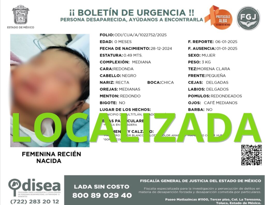 Tultitlán, Estado de México, 7 de enero de 2025.- Elementos de la Fiscalía General de Justicia del Estado de México, en coordinación con la Dirección de Seguridad Pública y Tránsito Municipal de Tultitlán, localizaron a una recién nacida de 10 días que había sido reportada como desaparecida el pasado 2 de enero.