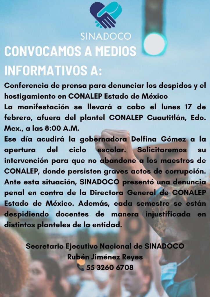 De la misma manera CONALEP atreves del Secretariado Ejecutivo Nacional de SINADACO convoco a manifestarse para denunciar despidos injustificados y hostigamiento al personal en el plantel CONALEP de Cuautitlán, donde se espera que asista la Gobernadora del Estado de México, delfina Gómez Álvarez, a la apertura del ciclo escolar.