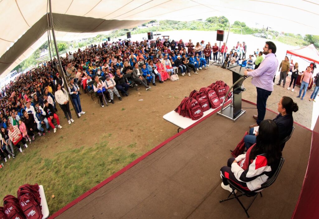 El presidente municipal de Naucalpan, Isaac Montoya Márquez, encabezó la entrega de 1,200 kits escolares en el campo de fútbol El Torito, de la colonia Lomas de San Agustín, como parte del programa de apoyo a la economía familiar y al impulso de la educación de niñas, niños y adolescentes del municipio.