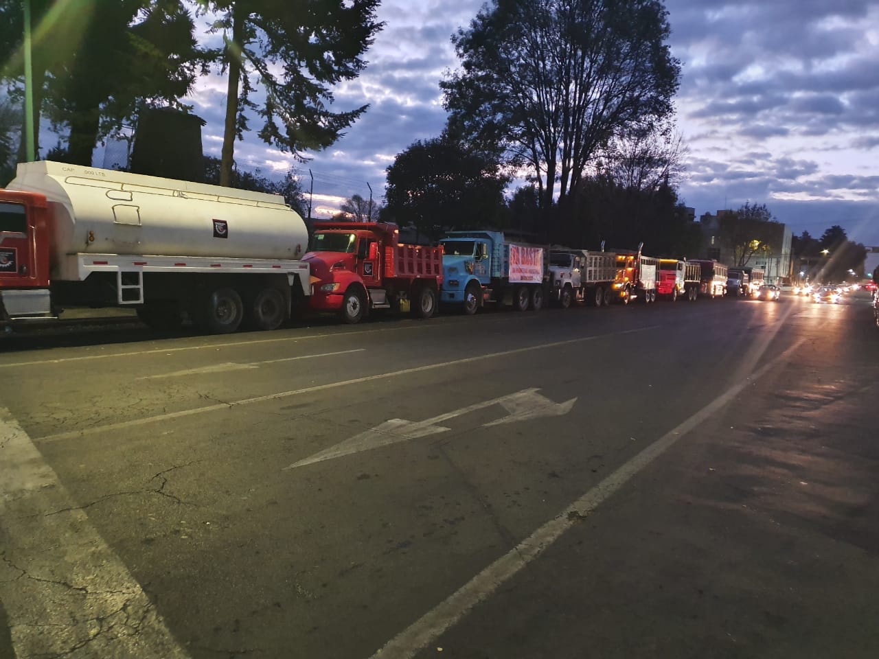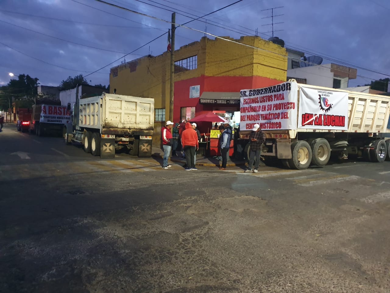 Transportistas de SINDICATOS UNIDOS DE MÉXICO se manifiestan frente a la Secretaría del Trabajo en el Estado de México exigiendo se le dé trámite legal al emplazamiento a huelga sobre el distribuidor vial de San Mateo Atenco, también piden se les tome en cuenta para las obras del Parque temático del Centro Histórico y El Aeropuerto Internacional de Toluca
