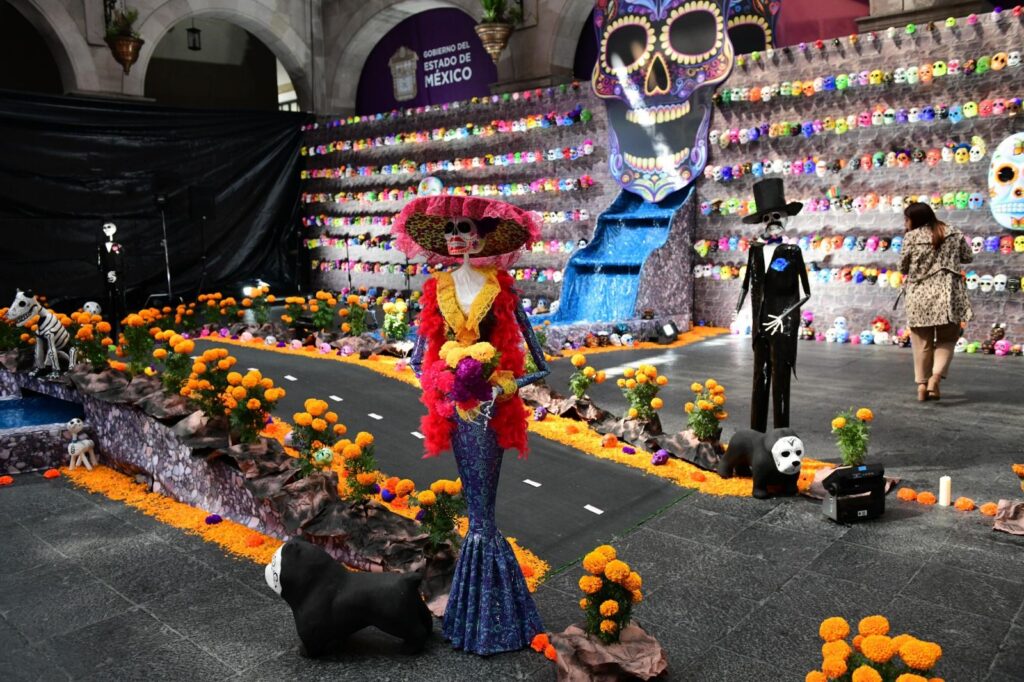 Este montaje también incluye tapetes de aserrín y figuras simbólicas como el colibrí, que representa el regreso de los espíritus; el xoloitzcuintle, guía en el viaje al Mictlán; y la figura de Mictlantecuhtli, Dios de la Muerte. Además, cinco catrinas personifican a las etnias originarias del Estado de México: Matlatzinca, Mazahua, Nahua, Otomí y Tlahuica.