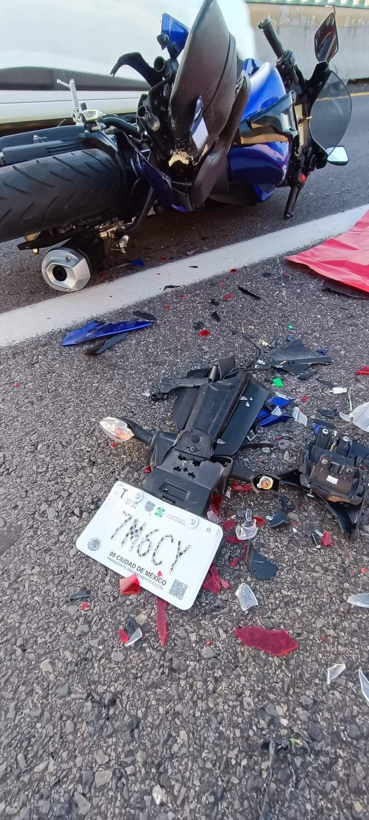 Sobre la citada vía, justo a la altura de San Pedro Xalostoc,, dirección a la capital del país, quedó el cuerpo sin vida del masculino junto a los restos de una motocicleta marca Yamaha, color entre azul y morado-negro R-15 con placas : 7M6CY