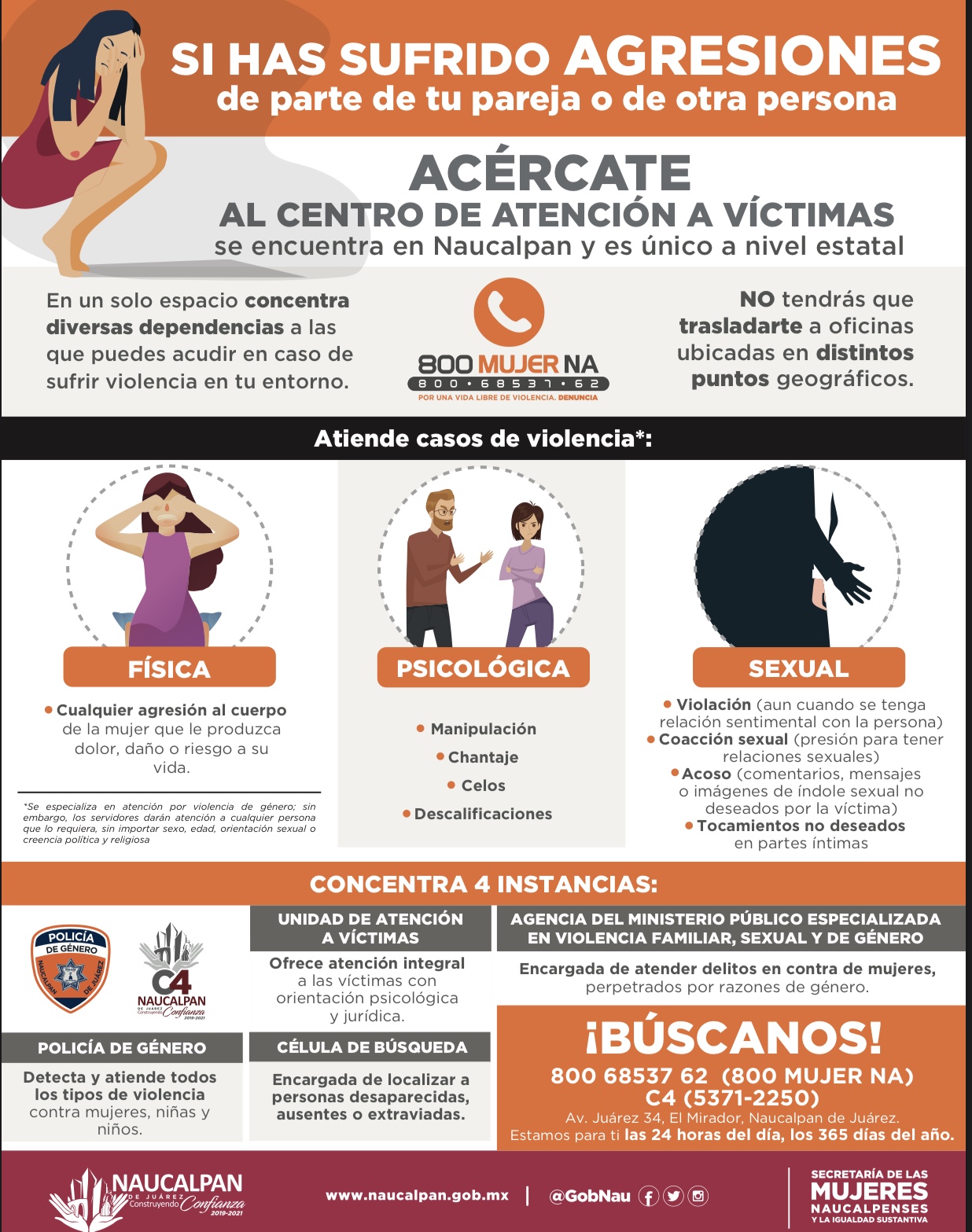 Además del Centro de Atención a Violencia de Género y la Secretaría de las Mujeres, el Gobierno de Naucalpan cuenta con 800 MUJERNA (800-68537-62), una línea de atención telefónica gratuita, disponible las 24 horas del día, los 365 días del año. A través de un modelo de contención emocional y protocolos de atención personalizados, los operadores telefónicos realizarán intervenciones o canalizaciones a otras áreas a las mujeres que lo soliciten.