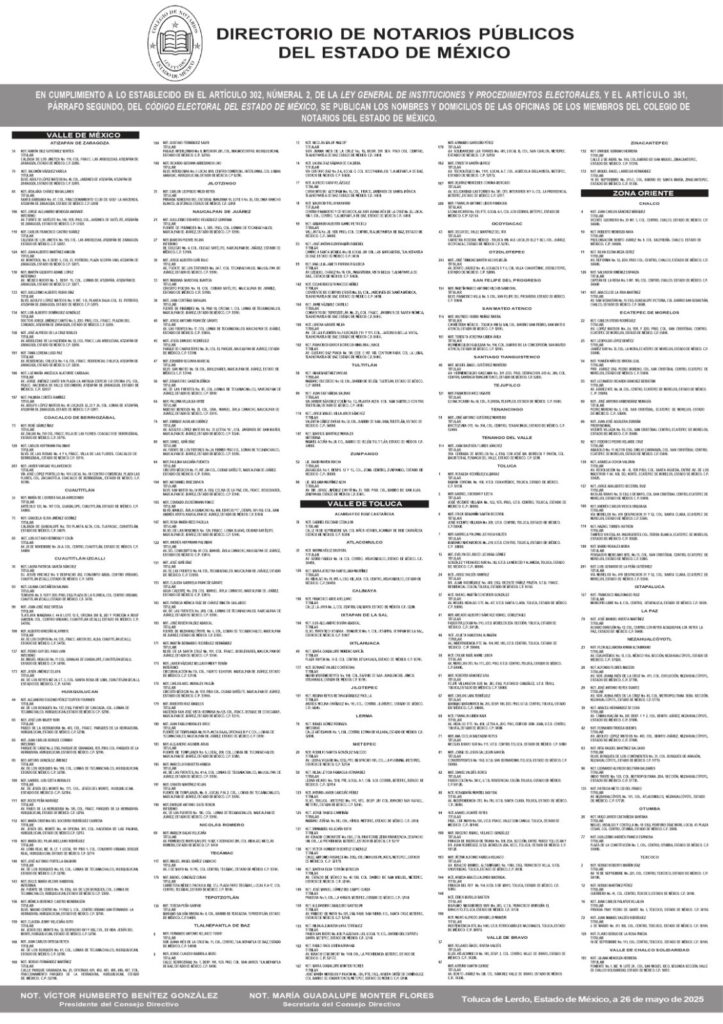 El Colegio de Notarios del Estado de México habilitó un directorio digital en su sitio web colegiodenotariosedomex.org.mx, donde las y los interesados podrán ubicar la notaría más cercana, con información sobre domicilios y teléfonos de contacto.