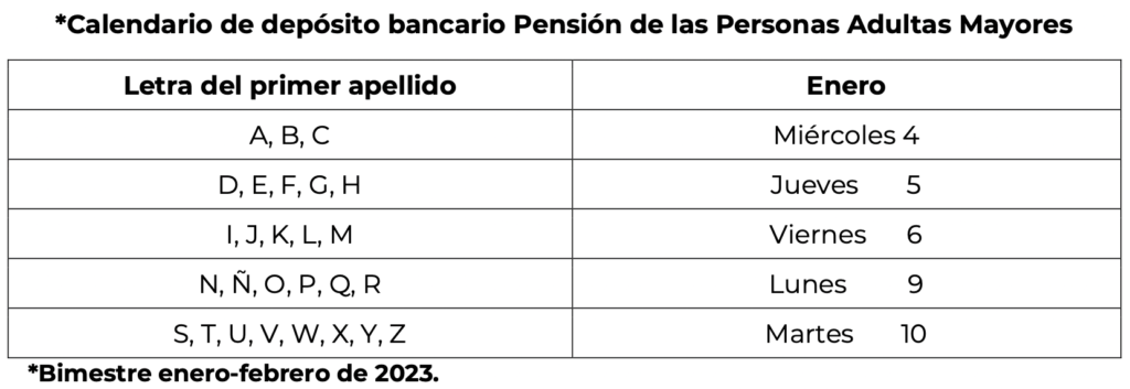 Informó que del 4 al 10 de enero se realizará la dispersión de pagos correspondiente al bimestre enero-febrero, ya con el incremento, y para mejor atención de los derechohabientes este depósito se realizará de acuerdo con la letra del primer apellido de las personas adultas mayores que cobran con tarjeta de cualquier institución bancaria.