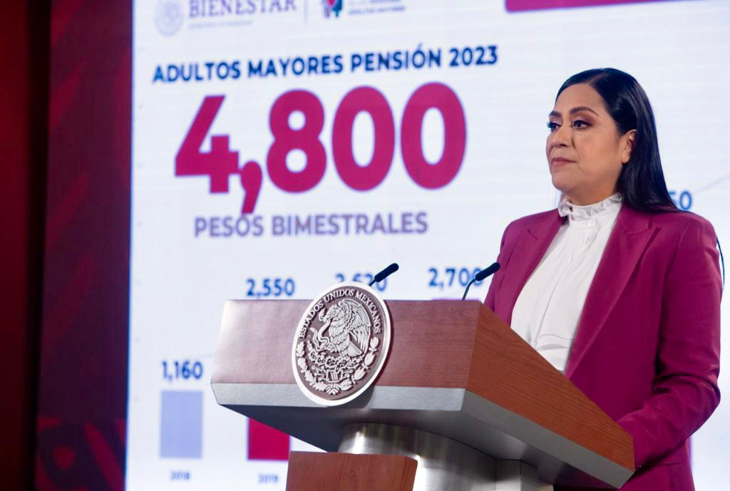 La Pensión para el Bienestar de las Personas Adultas Mayores se incrementa 25 por ciento y pasará de tres mil 850 pesos en 2022 a cuatro mil 800 pesos bimestrales en 2023, mientras que el padrón crecerá de 10 millones 537 mil 181 derechohabientes a 11 millones 56 mil 534 en el primer bimestre del año, anunció la secretaria de Bienestar, Ariadna Montiel Reyes, en la conferencia de prensa matutina del presidente Andrés Manuel López Obrador.