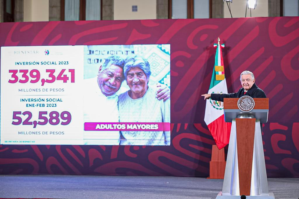 En el Salón de la Tesorería de Palacio Nacional, la titular de Bienestar subrayó que la inversión social de la pensión para 2023 asciende a 339 mil 341 millones de pesos. En el bimestre enero-febrero se invierten 52 mil 589 millones de pesos para garantizar este derecho plasmado en el artículo 4° constitucional. Además, se entrega de manera directa y sin intermediarios.