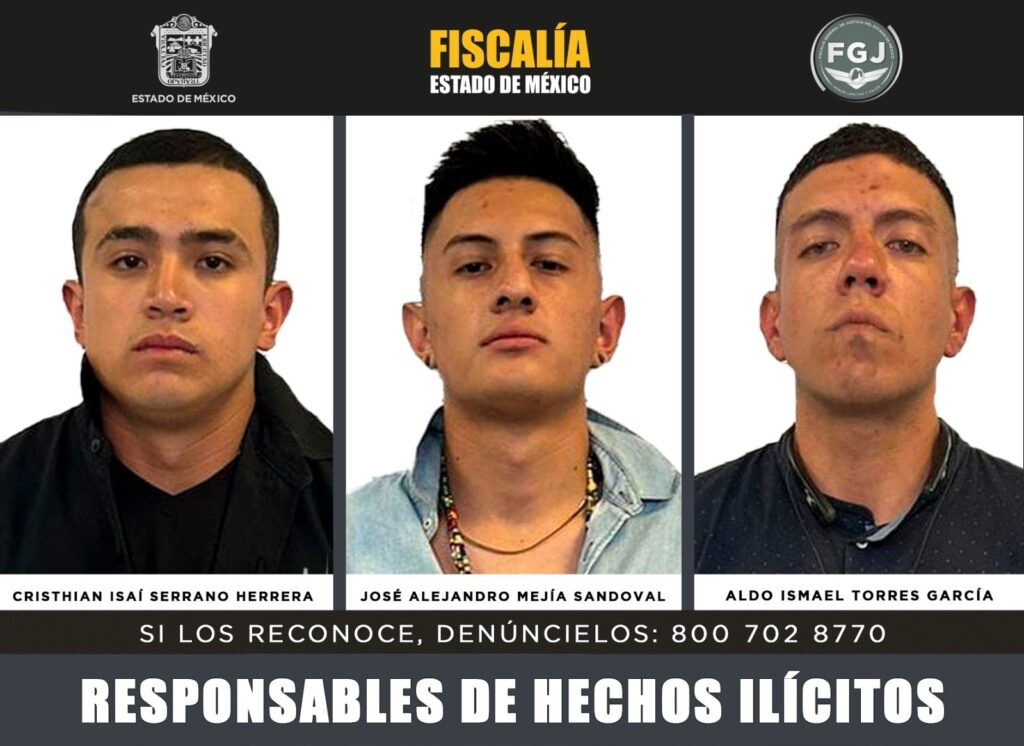 Toluca, Estado de México, 30 de septiembre de 2025.- La Fiscalía General de Justicia del Estado de México (FGJEM) obtuvo una sentencia condenatoria de 70 años de prisión para José Alejandro Mejía Sandoval, Christian Isaí Serrano Herrera y Aldo Ismael Torres García, por su responsabilidad en el delito de secuestro exprés con fines de robo.