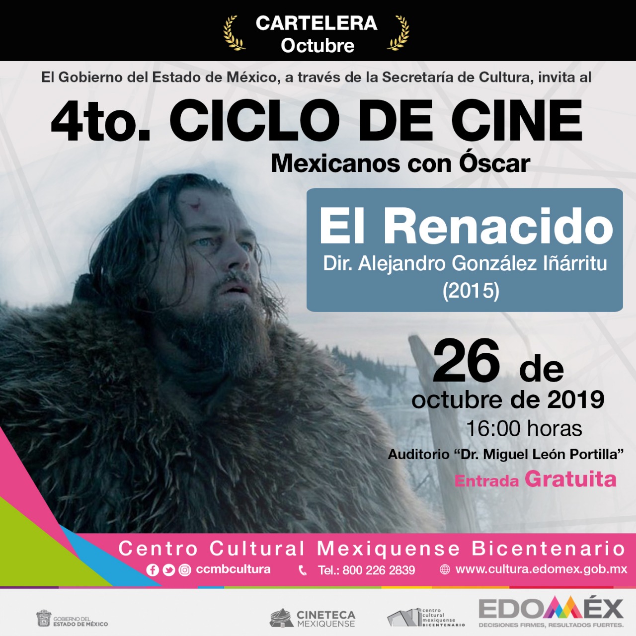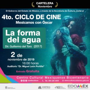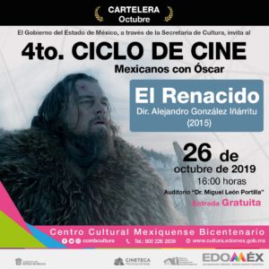 *Texcoco, Estado de México, 10 de octubre de 2019.* Como parte de la programación del Cuarto Ciclo de la Cineteca Mexiquense, en el Centro Cultural Mexiquense Bicentenario (CCMB), se presenta el ciclo “Mexicanos con Óscar”, que se realizará del 12 de octubre al 2 de noviembre, a las 16:00 horas en el Auditorio Miguel León Portilla.