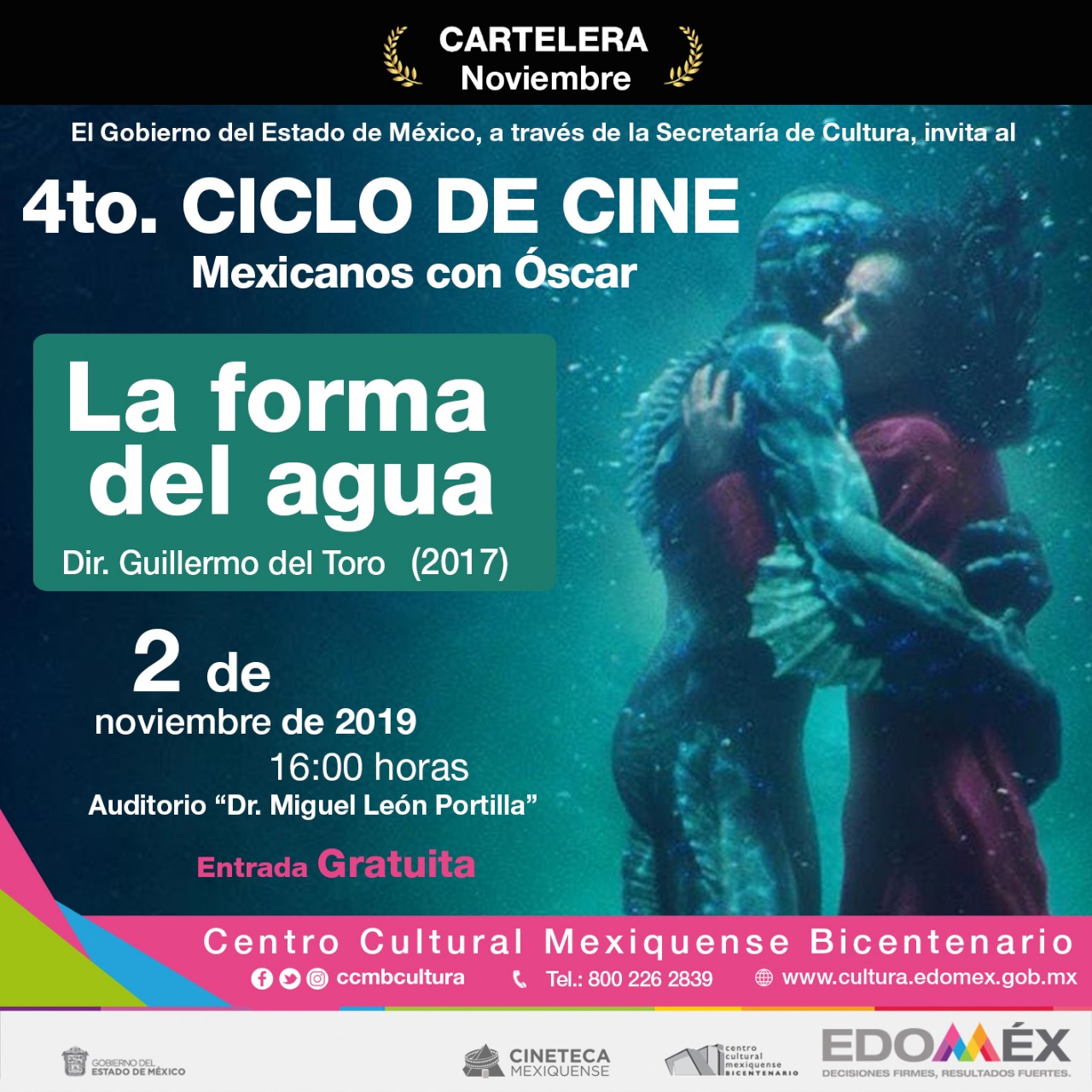 Finalmente, el 2 de noviembre, de Guillermo del Toro, La forma del agua (2017) ganadora a Mejor Película, ambientada en Baltimore en 1962, que trata sobre una joven intendente que trabaja en un laboratorio de alta seguridad y se enamora de una criatura anfibia que se encuentra capturada en ese lugar.