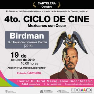 Para el 19 de octubre se proyectará la película Birdman (2014), de Alejandro González Iñárritu, donde el actor de Hollywood, Riggan Thomson, con una carrera en descenso y recordado únicamente por un papel como superhéroe, lucha por montar una obra de teatro y obtener su verdadero reconocimiento como actor. Un filme reconocido por su producción, proceso de edición y postproducción, ganadora en la categoría de Mejor Película.