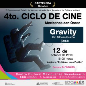 El ciclo iniciará el 12 de octubre con Gravity (2013), película británico-estadounidense de ciencia ficción, dirigida, producida, co-escrita y co-editada por Alfonso Cuarón, ganadora de siete premios Óscar. La historia se desarrolla en el espacio, donde la doctora Ryan Stone encontrará adversidades al enfrentarse a una peligrosa nube de desechos.