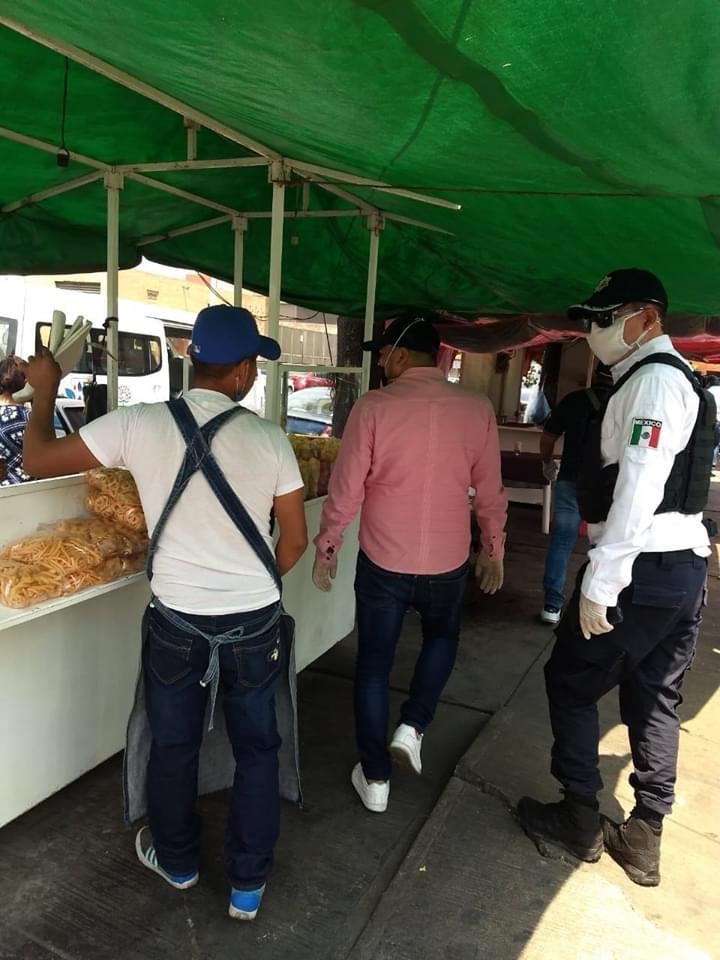 Durante los recorridos se verificó que sólo estuvieran en funcionamiento establecimientos de actividades y productos esenciales, que los locales y puestos de comida únicamente ofrecieran servicio para llevar, que aplicaran las medidas de sana distancia, el uso de cubrebocas y gel antibacterial.