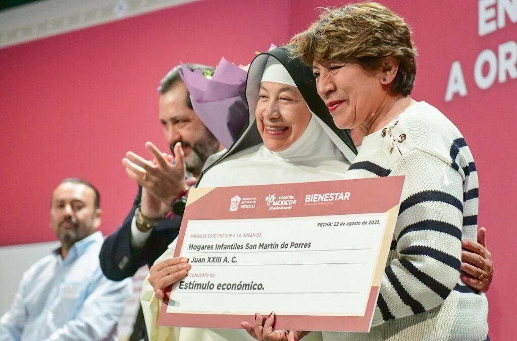 Texcoco, Méx., 22 de agosto de 2025.– La gobernadora del Estado de México, Delfina Gómez Álvarez, encabezó la Entrega de Estímulos Económicos a Organizaciones de la Sociedad Civil, donde reconoció la labor altruista de asociaciones dedicadas a apoyar a la población más vulnerable de la entidad.