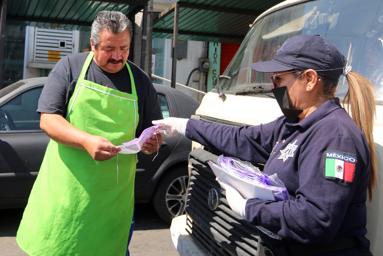 Los elementos de la Dirección General de Seguridad Ciudadana y Tránsito Municipal entregaron a transeúntes, locatarios y conductores de transporte público mascarillas desechables e información sobre cómo protegerse del coronavirus tanto en casa como en la calle, si por algún motivo de fuerza mayor tienen que salir.