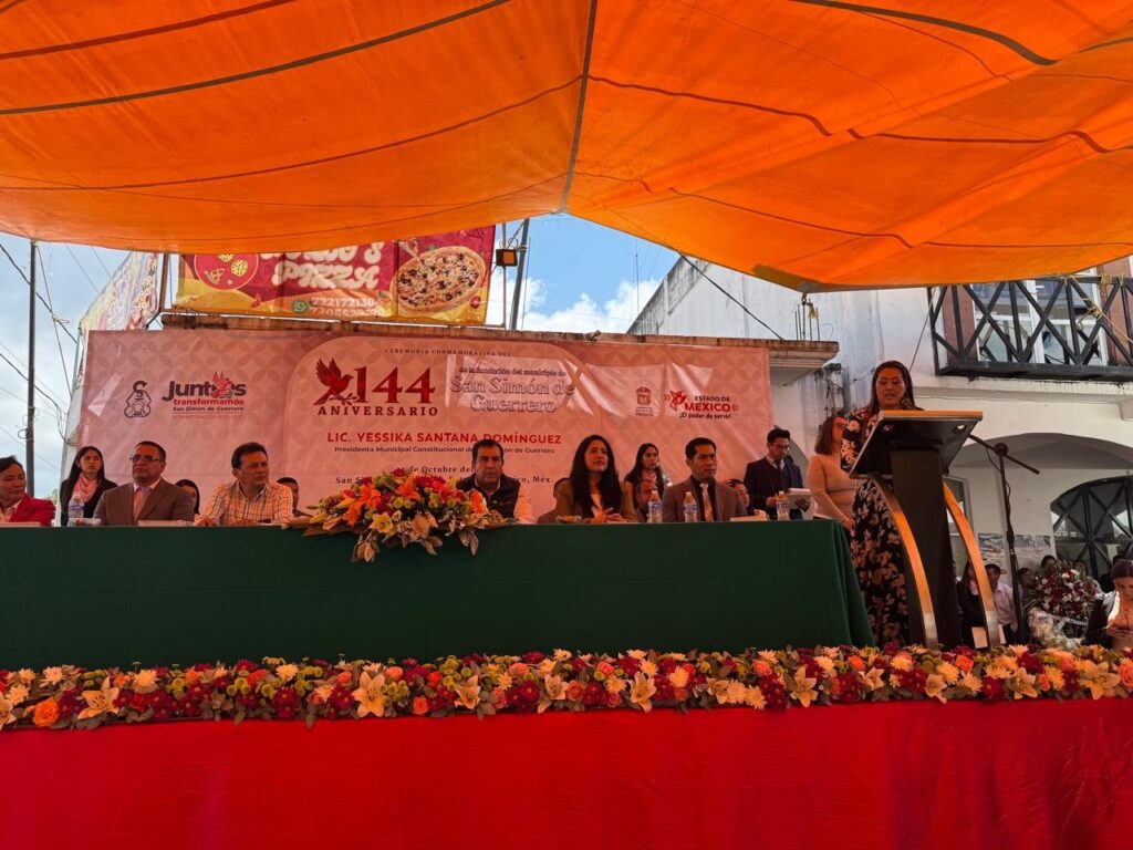 San Simón de Guerrero, Méx.- Al conmemorar 144 años de vida institucional, la presidenta Yessika Santana Domínguez, refirió que la cabecera municipal de San Simón de Guerrero tiene un origen único y ancestral, en los inicios de su identidad fue llamado “San Simón Cuitepec”, cuyo significado es “En el cerro donde se escuchan cantos”: