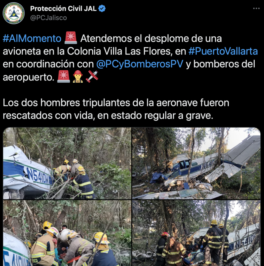 Al rededor de las 8:40 de la mañana se informó sobre el desplome en la colonia Villa de las Flores, en donde los servicios de emergencia lograron rescatar con vida a los dos tripulantes con lesiones de gravedad al Hospital Regional de Puerto Vallarta.