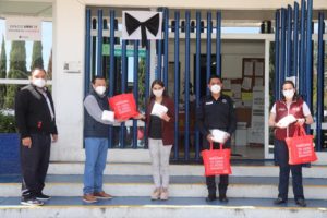 La titular del organismo asistencial, Mariana Cabeza Gamboa, acompañada de la Directora general de la misma institución y del responsable de la Corporación de policía municipal, Sara López Escobedo y Eduardo Esaú Sánchez Sánchez, respectivamente, recibieron del gerente de las tiendas de conveniencia, Alejandro Arellano Torres, el material que permitirá prevenir riesgo de contagios de los servidores públicos que realizan tareas en campo y de la ciudadanía a la que sirven, cuidando así la salud de la población que ha sido sello distintivo de la administración de Gaby Gamboa.