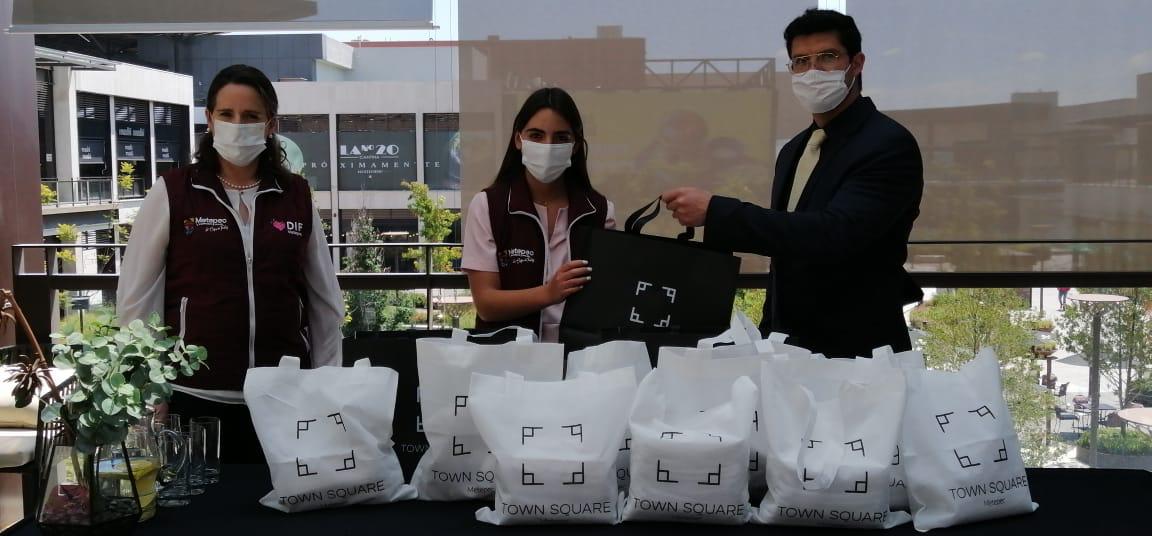 En esta ocasión, el reconocido Centro Comercial Town Square Metepec, entregó al Sistema Municipal DIF (SMDIF), la aportación de 500 mascarillas y 100 unidades de gel antibacterial para uso individual, accesorios de alta utilidad para proteger la salud de la población.