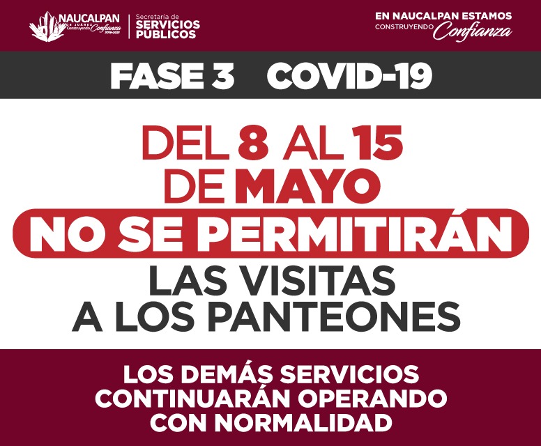 El Secretario de Servicios Públicos de Naucalpan, Carlos Trujillo Anell, informó que con esta medida se refuerzan las medidas de distanciamiento social que forman parte de la Fase 3 de la emergencia sanitaria.