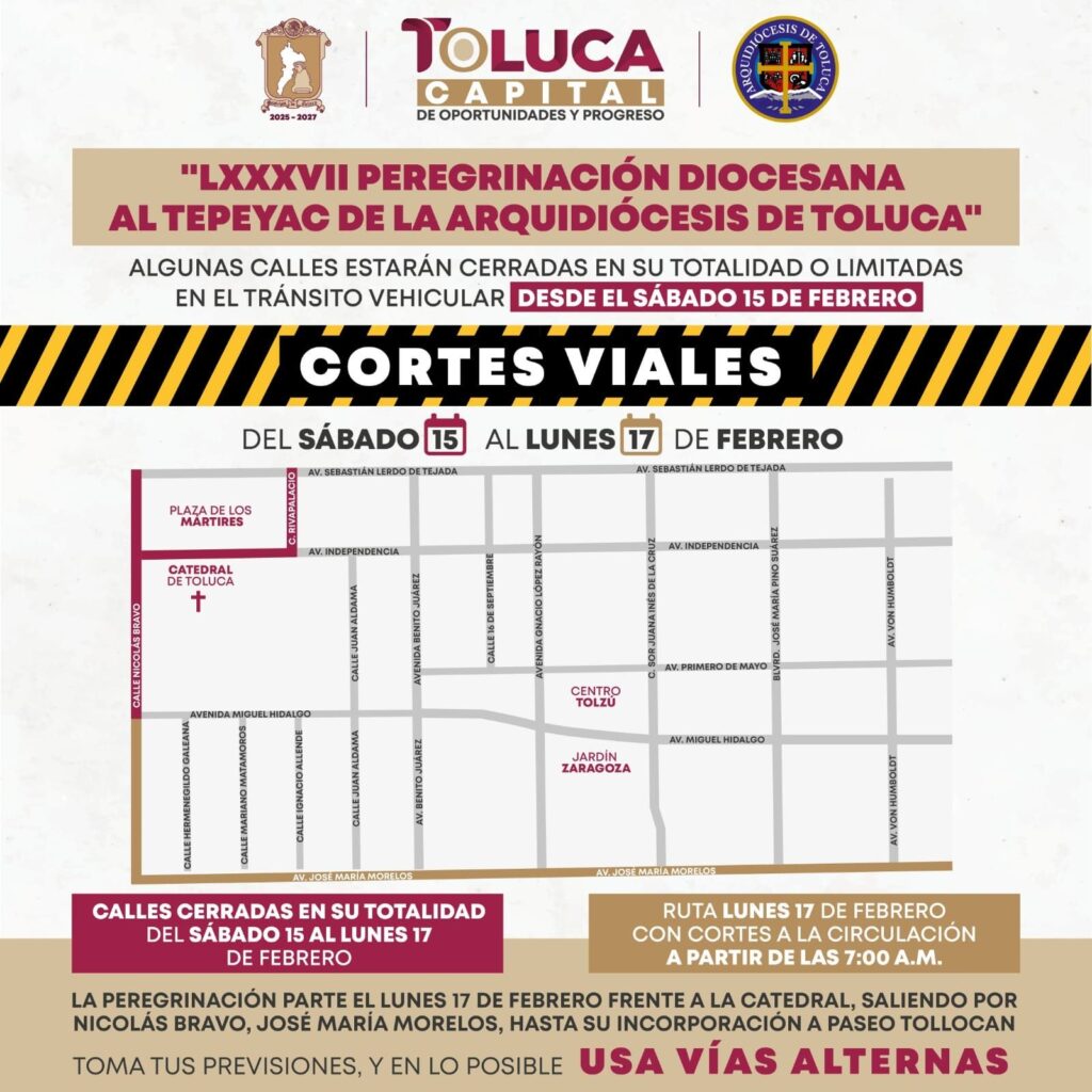 Toluca, Estado de México.- El gobierno municipal de Toluca informó que habrá cierres viales parciales y totales del 15 al 17 de febrero debido a la 87ª Peregrinación Diocesana al Tepeyac de la Arquidiócesis de Toluca.