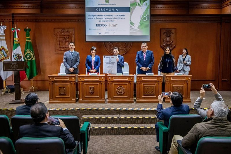 Toluca, Méx., 12 de noviembre de 2024. — La Universidad Autónoma del Estado de México (UAEMéx) recibió un reconocimiento de la empresa EBSCO por ser la primera universidad en México en implementar el sistema de administración bibliotecaria Folio. Este sistema permite gestionar y optimizar los recursos tecnológicos para la consulta académica y científica, impulsando el acceso rápido y sencillo a una extensa colección de información.