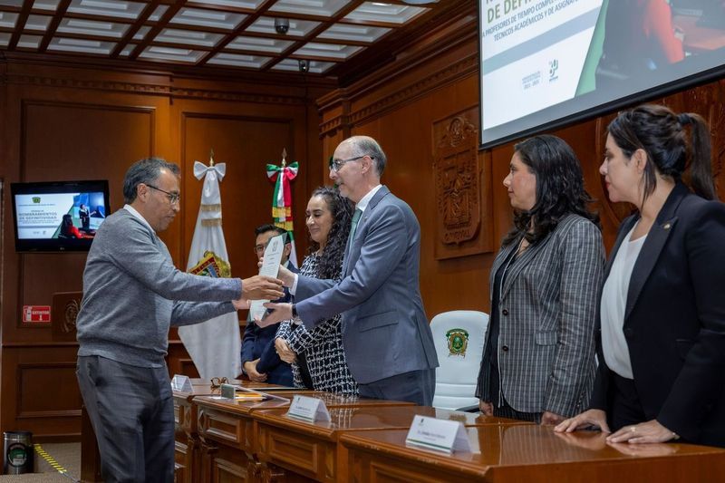 La Universidad Autónoma del Estado de México (UAEMéx) celebró una ceremonia para reconocer la contribución de su cuerpo docente a la consolidación de una institución de alta calidad educativa. Encabezada por el rector Carlos Eduardo Barrera Díaz, se llevó a cabo la entrega de 39 nombramientos de definitividad a profesores de tiempo completo, medio tiempo, técnicos académicos y de asignatura, en la Sala «Benito Juárez García» del Edificio de Rectoría.