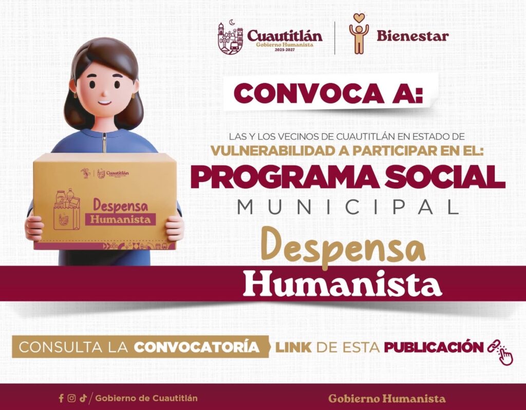 El Gobierno Municipal de Cuautitlán, encabezado por la alcaldesa Juanita Carrillo, recordó a la ciudadanía que el próximo 14 de julio concluye el periodo de registro para el programa “Despensa Humanista 2025”, una iniciativa social dirigida a habitantes en situación de vulnerabilidad económica.